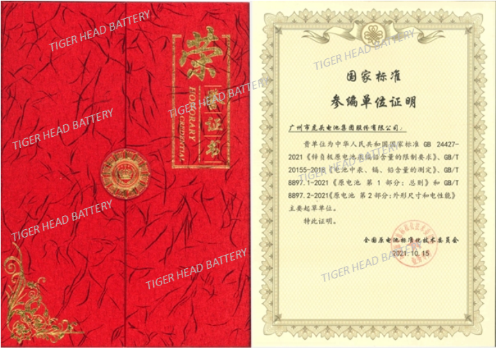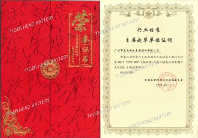 Группа батарей Tiger Head активно участвует в разработке основных национальных стандартов, касающихся первичных батарей (GB24427-2021 «Требования к ограничению содержания ртути, кадмия и свинца в первичных батареях с цинковым анодом», GB/T8897.1-2021 «Первичные батареи», часть 1: Общие положения, GB/T8897.2 – Первичные батареи, часть 2: Размеры, электрические свойства и т. д.) и отраслевые стандарты (QB/T2629-2021 Электролитический диоксид марганца для щелочных батарей на основе диоксида цинка и марганца). Недавно компания Tiger Head получила почетный сертификат главного чертежного подразделения, выданный Национальным техническим комитетом по стандартизации первичных батарей. Вышеупомянутые три национальных стандарта были одобрены и выпущены Государственной администрацией по регулированию рынка и Национальной администрацией по стандартизации и будут официально внедрены 1 ноября этого года.