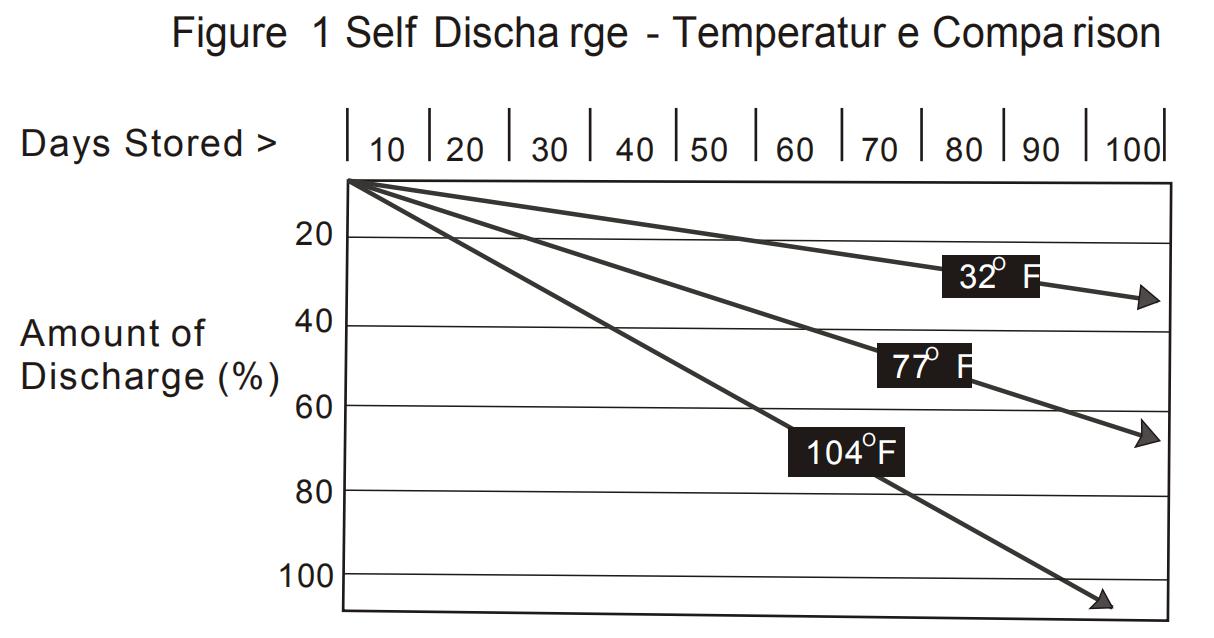 Даже когда мотоцикл не используется, эти аккумуляторы разряжаются (САМОРАЗРЯД) со скоростью примерно 0,5–1% в неделю. Скорость разряда увеличивается при повышении температуры. Примерные скорости разряда показаны на рисунке 1 справа.