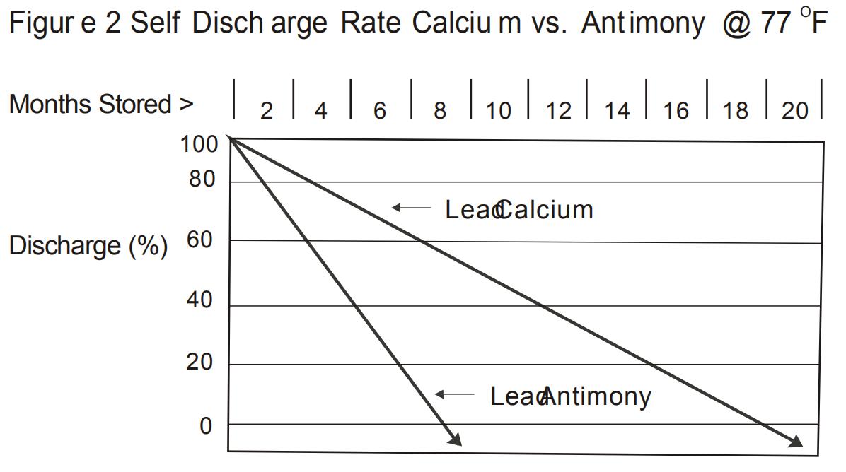 Мотоциклетные аккумуляторы, изготовленные по свинцово-кальциевой технологии, имеют более длительный срок службы, поскольку сохраняют заряд более чем в три раза дольше, чем обычные свинцово-сурьмянистые аккумуляторы. Эти аккумуляторы разряжаются (САМОРАЗРЯД) примерно на 0,15–0,3% в неделю. См. рисунок 2 справа. Некоторые свинцово-кальциевые аккумуляторы также содержат специальный химикат, препятствующий сульфатированию пластин.