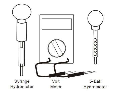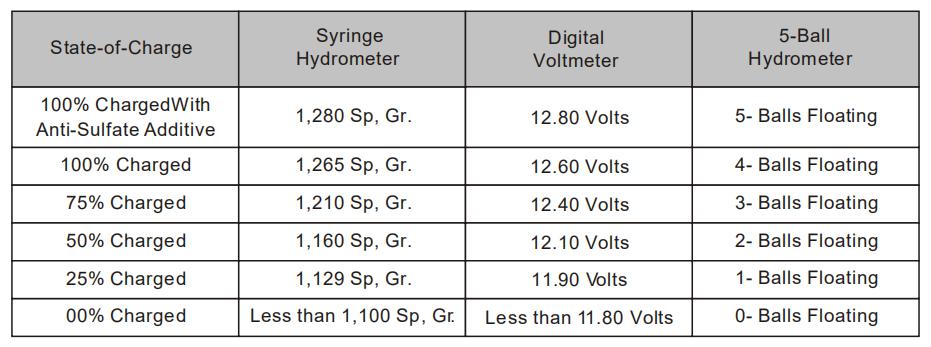 Для проверки уровня заряда аккумулятора можно использовать один из трёх методов: 1) шприцевой ареометр, 2) вольтметр или 3) пятишариковый ареометр. Сравнительная таблица трёх методов определения точного уровня заряда представлена в таблице ниже.